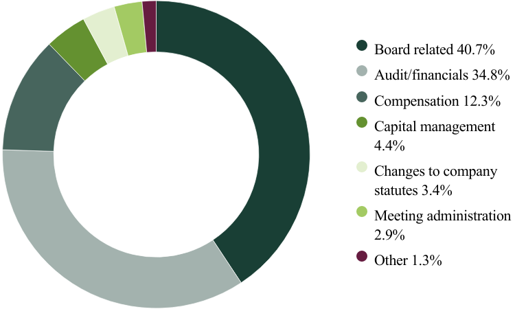Source for company information: Stewart Investors investment team and company data. This stock information does not constitute any offer or inducement to enter into any investment activity. Portfolio data shown is from representative strategy accounts of the strategy shown above. Proxy voting chart numbers may not add to 100 due to rounding. SHP means: Shareholder Proposal.