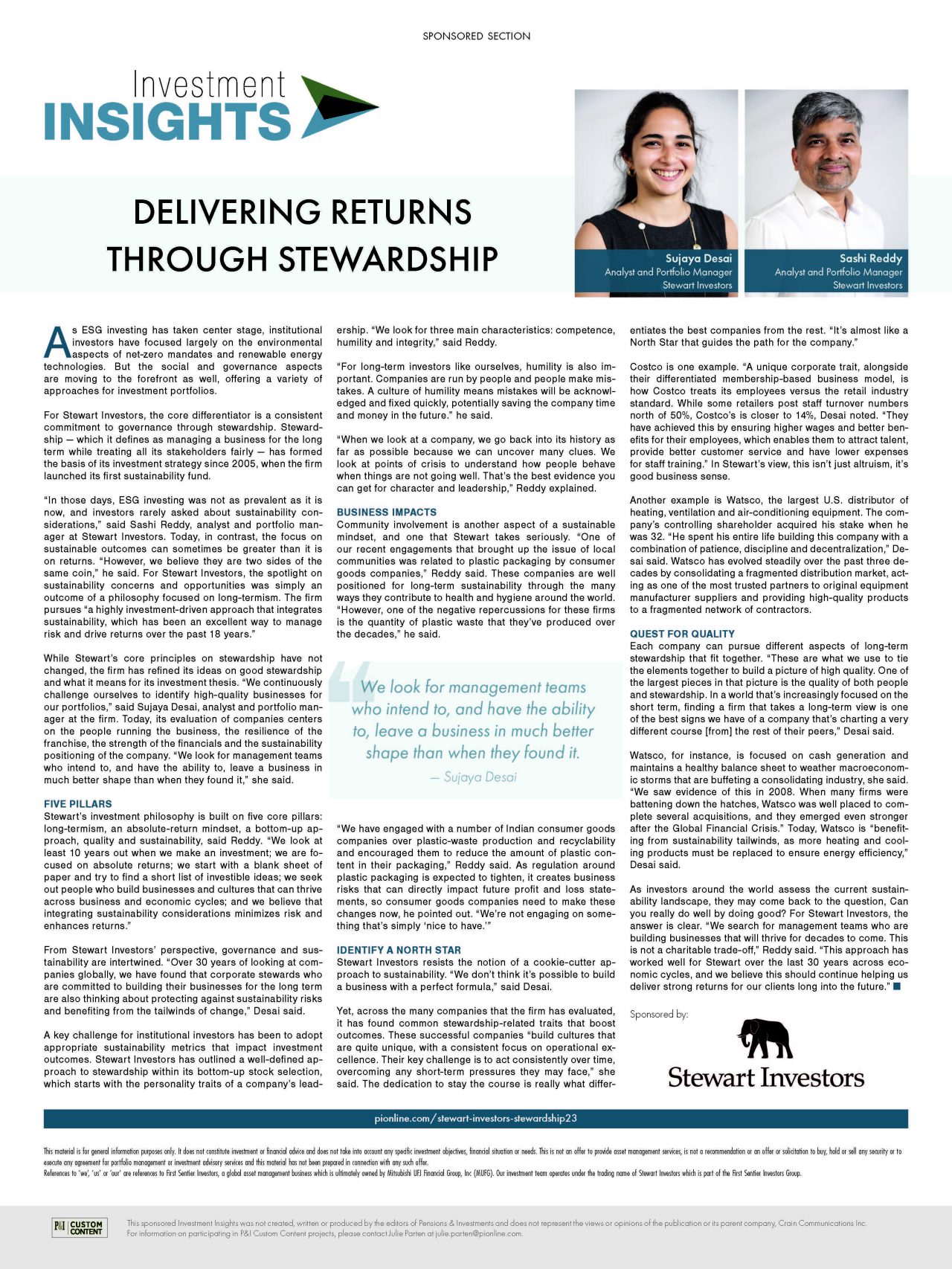 Download PDF versionSashi Reddy and Sujaya Desai speak to Pensions & Investments about the importance of stewardship, and how we look for management teams who have the intention and ability to leave businesses in much better shape than they found them in.